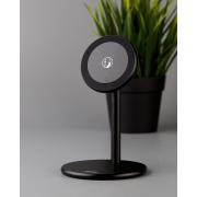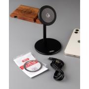 Зарядное устройство имеет форму круглой пластины, которая с помощью магнита фиксируется на металлической подставке. В комплект входит металлическое кольцо с клейкой поверхностью на одной стороне, кольцо клеится на чехол или прямо на смартфон.